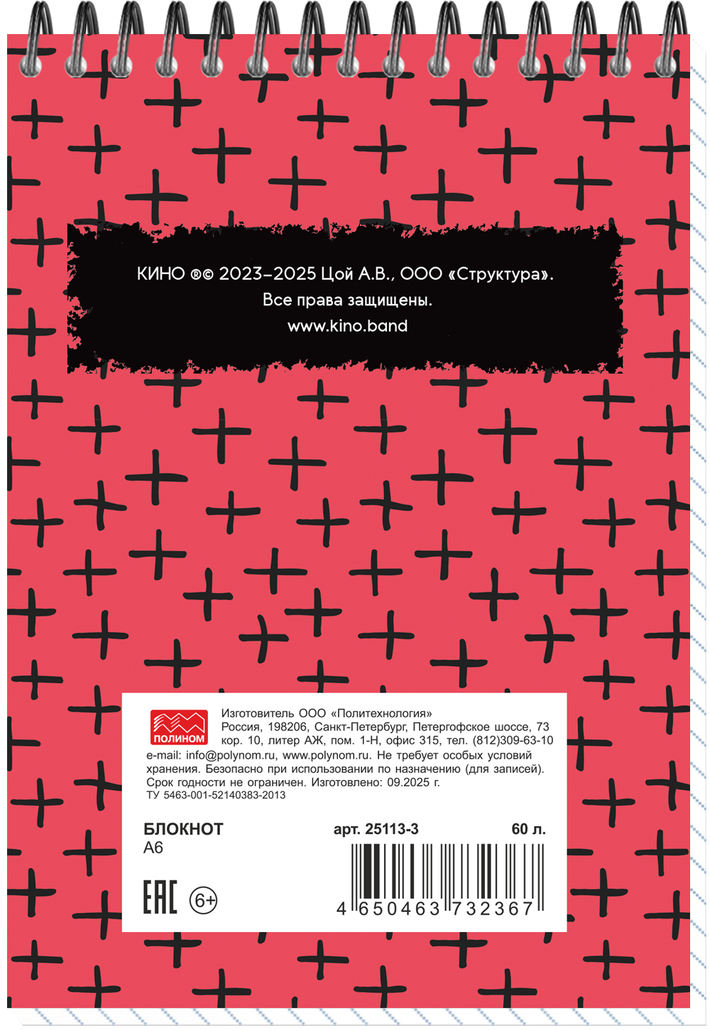 Блокнот А6 60л, ЦОЙ. КИНО №14, обложка-мелов.картон+софттач-лак, мет.гребень сверху, клетка