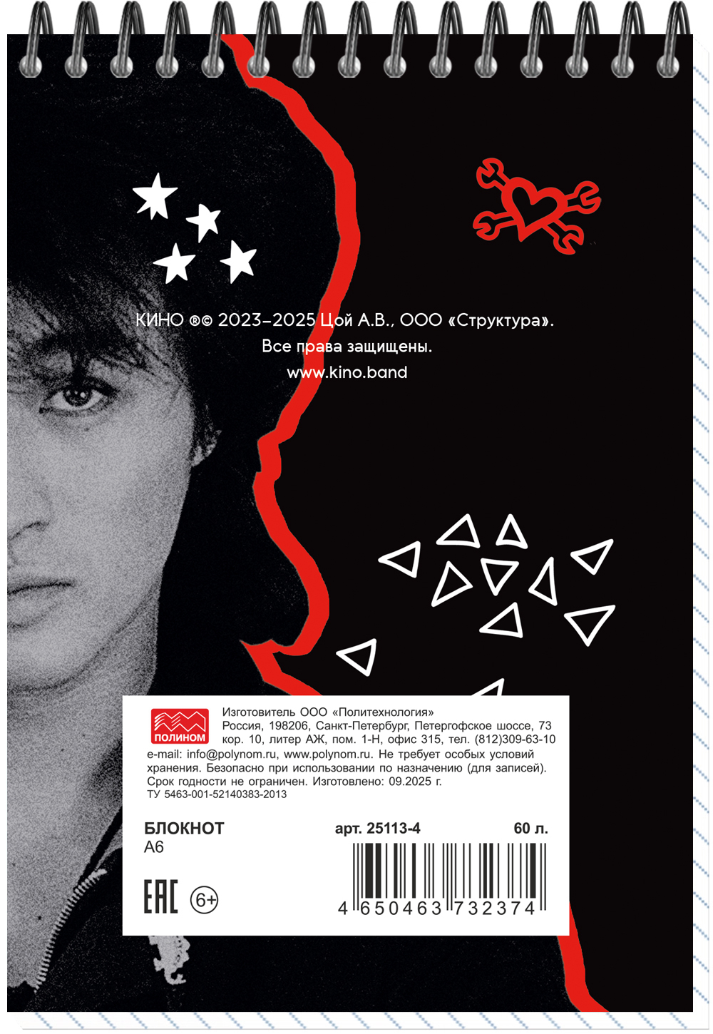 Блокнот А6 60л, ЦОЙ. КИНО №15, обложка-мелов.картон+софттач-лак, мет.гребень сверху, клетка