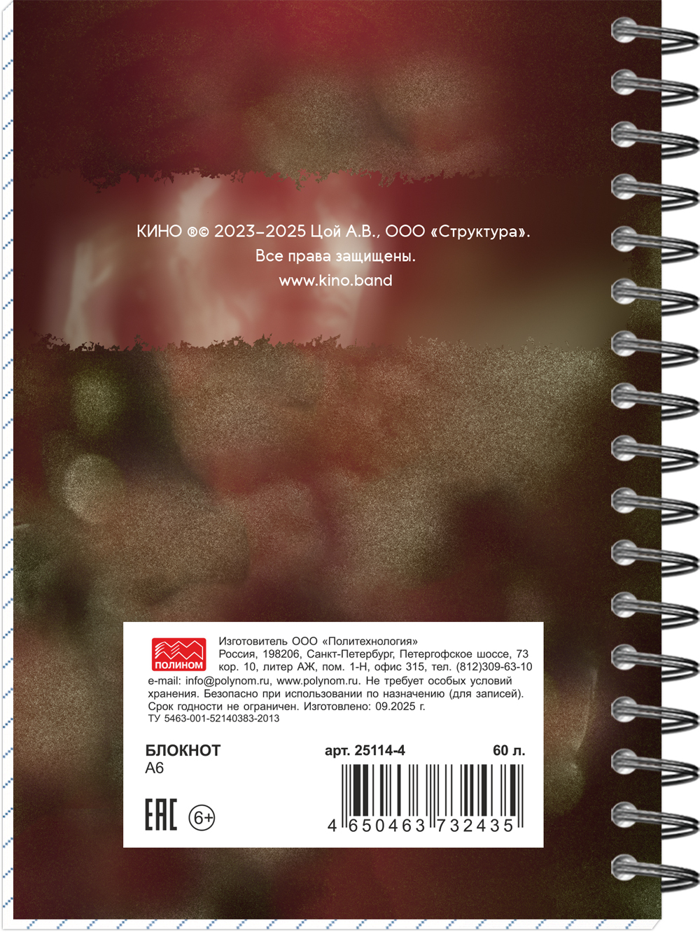 Блокнот А6 60л, ЦОЙ. КИНО №13, обложка-мелов.картон+софттач-лак, мет.гребень слева, клетка