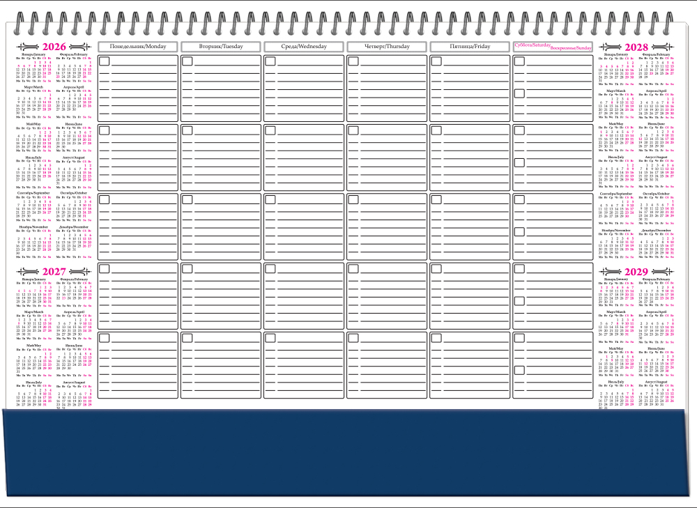 Ежемесячник-планинг настольный, 490х350, недатированный, календари на 4 года, блок – офсет 80 г/м кв., в две краски, прижимной клапан (синий бумвинил) снизу, на металлическом гребне, индивидуальная упаковка.